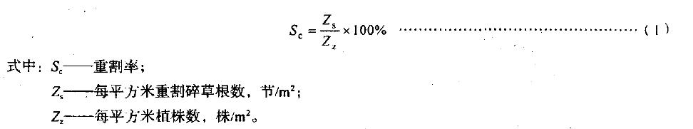 4.4.4重割率的測(cè)定:各測(cè)點(diǎn)平均每平方米的無(wú)頭草節(jié)數(shù)與每平方米平均牧草株數(shù)之比為重割草每點(diǎn)沿機(jī)組前進(jìn)方向取。0.5m長(zhǎng)(割幅小于2.5m時(shí)取lm長(zhǎng)),每一行程等間隔測(cè)兩處。