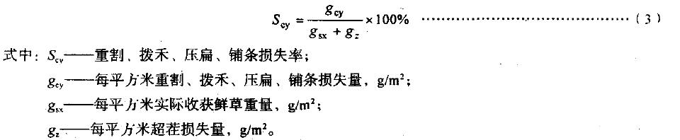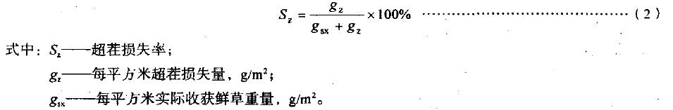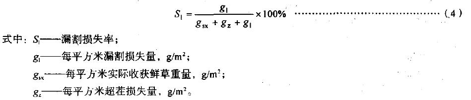 4.4.5.1超茬損失率:實(shí)際割茬高于當(dāng)?shù)啬翗I(yè)技術(shù)要求的割茬而造成的損失重量與應(yīng)割牧草重量之比甲其百分?jǐn)?shù)為超茬損失率。按式(2)計(jì)算: