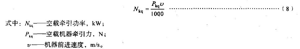 4.5.2.2 由地輪馭動(dòng)的機(jī)器,在額定前進(jìn)速度下的空載牽引功率消耗按式(8)計(jì)算: